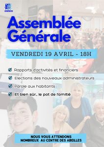 Les administrateurs du Centre des Abeilles vous invitent à l’Assemblée Générale qui se déroulera le vendredi 19 avril.