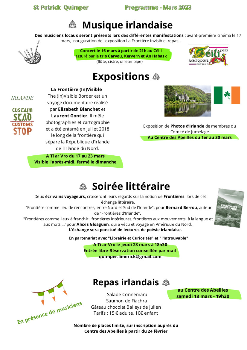 Le comité de jumelage Quimper-Limerick et le Centre des Abeilles vous invitent à venir fêter la Saint Patrick autour d’un atelier découverte de l’Irlande le samedi 18 mars. Nous vous proposons de venir déguster un repas irlandais accompagné de musique traditionnelle. Une exposition de photos réalisées par des membres du comité sera à votre disposition du 25 février au 30 mars au Centre.