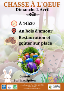 Rachel et toute l’équipe vous donne rendez-vous ce dimanche 2 avril à partir de 14h30 pour dénicher les œufs de Pâques qui seront cachés dans le Bois d’Amour. Un goûter sera offert à tous les participants.