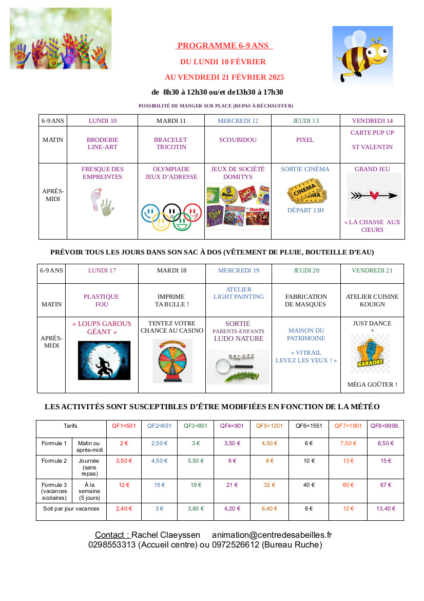 Les inscriptions (sous réserve de places disponibles) se font jusqu’à 24h à l’avance au secteur animation ou à l’accueil