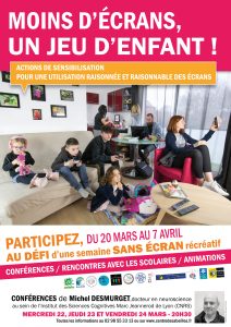 Échanges possibles sur …ce que les écrans permettent et sur ce qu’ils empêchent dans la construction des enfants et des jeunes ; la question du temps passé devant les écrans ; l’éducation aux écrans ; l’accessibilité permanente à des ilmages violentes (pornographie, conflits, maltraitance…) ; le problème du harcèlement… - Mardi 7/14/21/28 mars de 16h45 à 18h45 au Centre des Abeilles