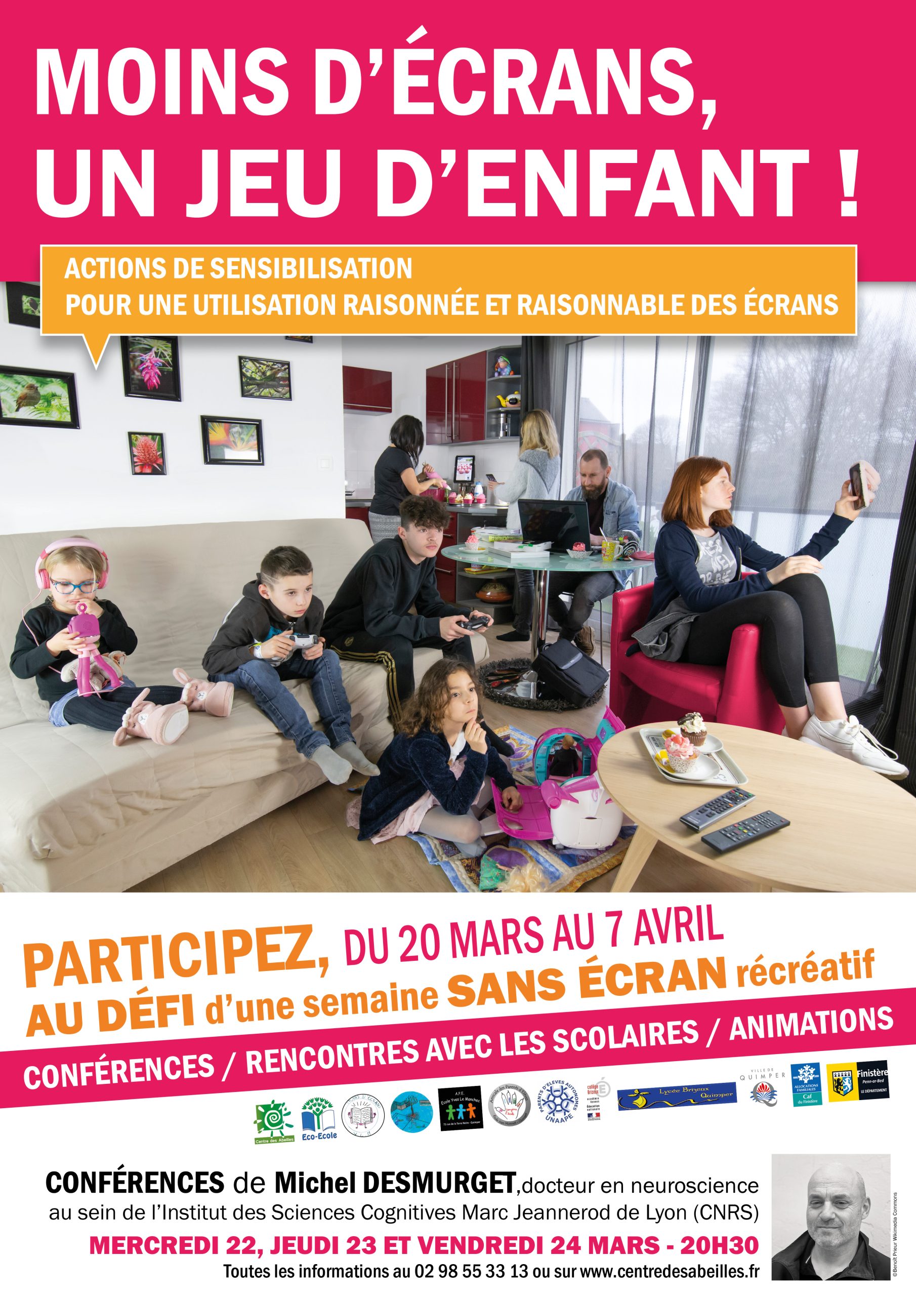 Le projet de semaine avec moins d’écrans récréatifs est un projet PEL (Projet éducatif local) qui réunit les écoles d’Yves Le Manchec, de Jean Monnet, de Ferdinand Buisson, le collège et le lycée Brizeux, les associations de parents d’élèves et les professionnels de accueils périscolaires ainsi que l’infirmière de territoire. Reporté à 3 reprises pour les raisons de crise sanitaire et de pandémie mondiale, il est enfin venu le temps de s’y consacrer et tout le monde peut y participer.
